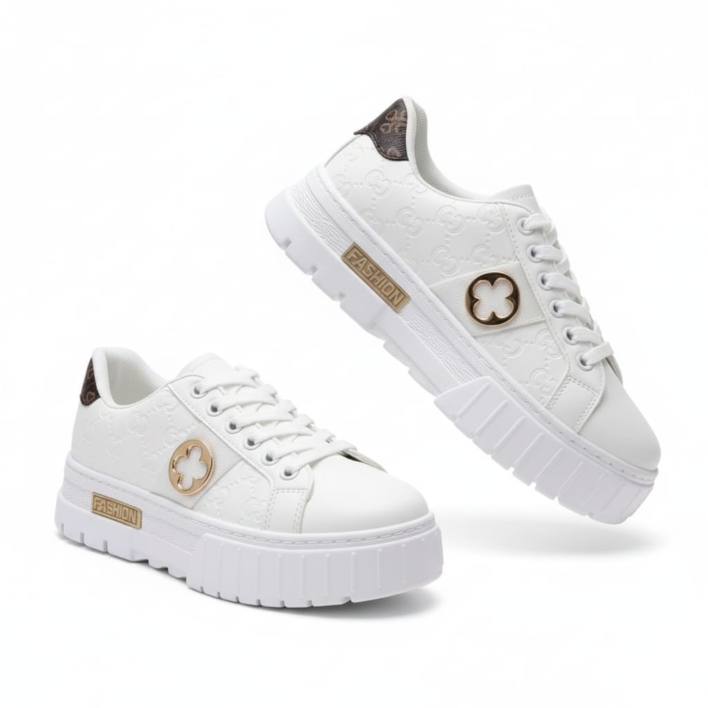 • حذاء سنيكرز نسائي يجمع بين الأناقة العصرية والراحة، مثالي للإطلالات اليومية والشبابية، ويتميز بتفاصيل شعارات ونعل سميك ملفت